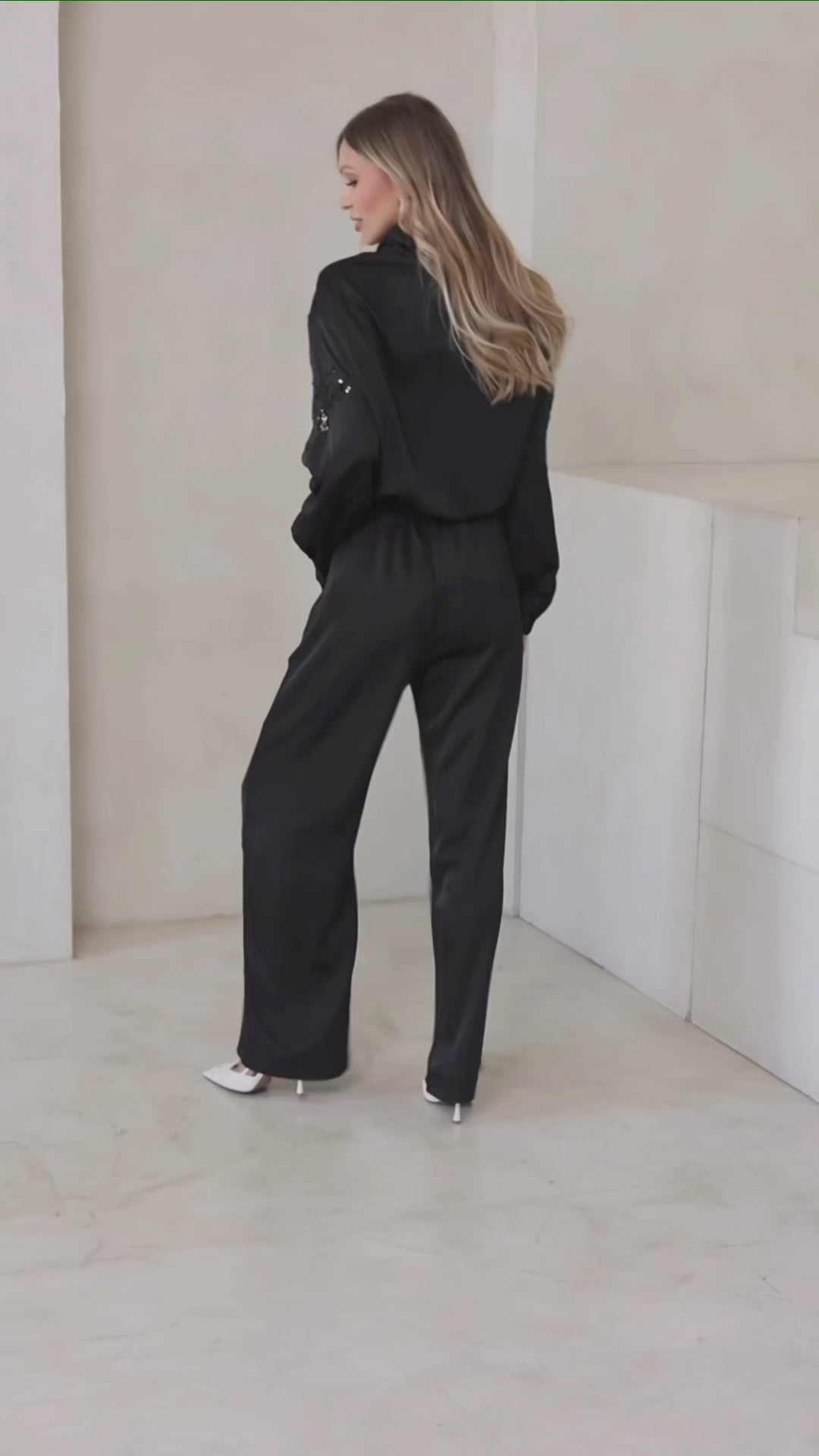 Különleges kétrészes szett elegáns fekete színben, fekete flitteres díszítéssel. Az egész szatén anyagon végigfutó flitterek gyönyörű virágformát alkotnak, amelyek különleges ragyogást és egyedi megjelenést kölcsönöznek a megjelenésednek. A hosszú ujjú, hajtott gallérral ellátott felső kifinomult eleganciát sugároz, míg a hozzá tartozó gumis nadrág tökéletesen illeszkedik a derékhoz. Ideális választás városi éjszakákra, ünnepi bulikra vagy egy különleges randevúra. A magabiztos nők alapdarabja, akik szeretnék kifejezni egyedi stílusukat!