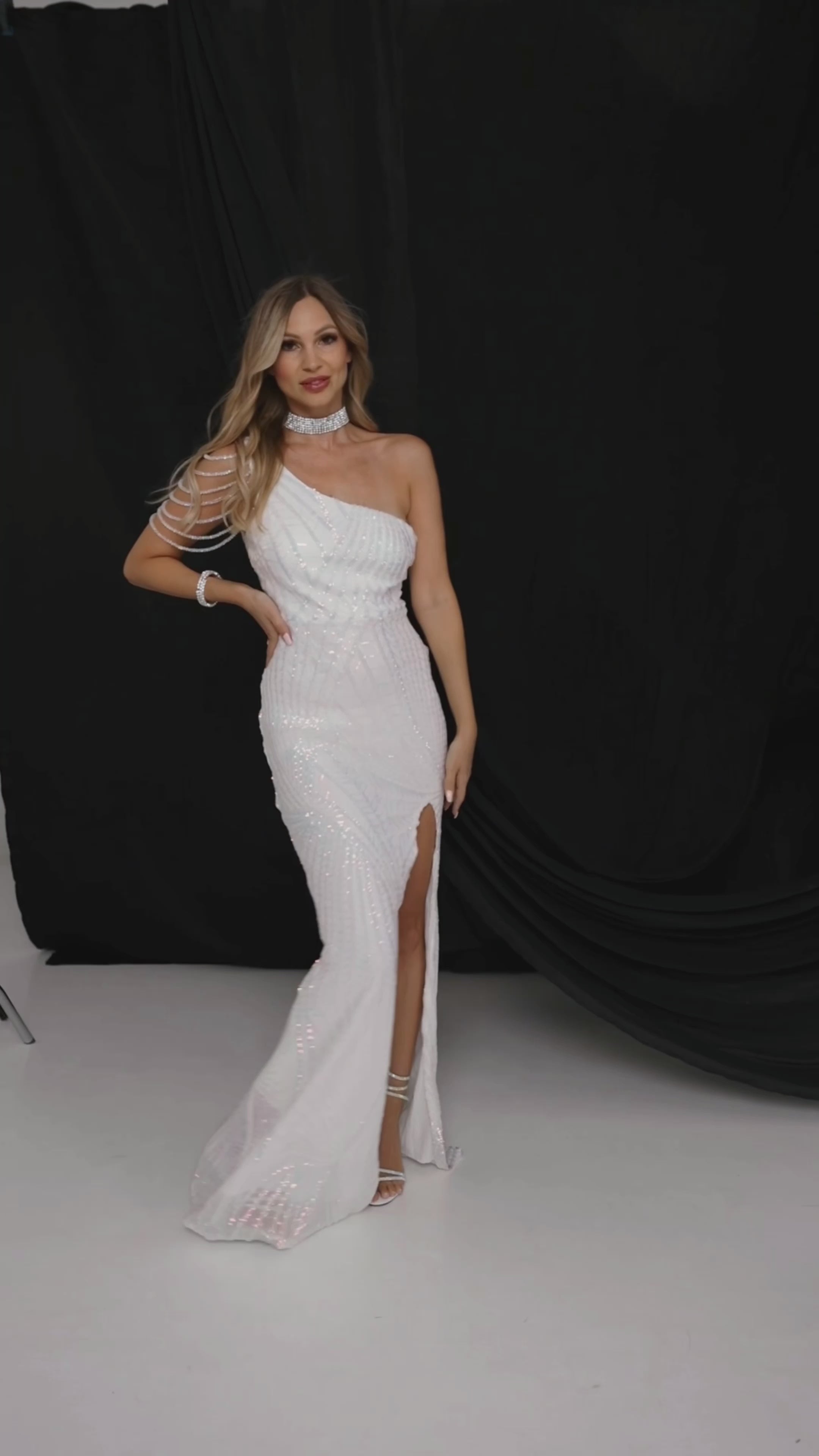 Tökéletesen szabott, testet követő sziluettel rendelkezik, ez a ruha a kortalan elegancia és a ragyogás megtestesítője. A vállrészen lefutó strasszos díszítés extra csillogást ad a megjelenésednek. A magasan hasított dizájn szexin emeli ki a lábakat. Ideális választás bálokra, gálavacsorákra, vörös szőnyeges eseményekre, vagy akár hivatalos eseményekre. Ha egy igazán egyedi megjelenésre vágysz, menyasszonyi ruhaként is viselheted. A ruha egyszerű eleganciája és csillogó részletei garantálják, hogy a legemlékezetesebb napodon is ragyogj